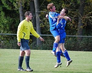 Umso erstaunlicher, dass sich die junge Mannschaft davon weitgehend unbeeindruckt zeigte und vor allem die 1:4-Schlappe vor Wochenfrist gegen Waldsolms schnell vergessen ließ. Unbändiger Einsatzwille und Laufbereitschaft waren die Attribute, die der RSV vor einer stattlichen Zuschauerkulisse in die Waagschale warf – und dafür am Ende auch verdientermaßen belohnt wurde. Ausgerechnet Eckstein-Ersatz Tim Eckhard, der in Reiskirchen sein Saisondebut in der „Ersten“ feiern durfte, war es vorbehalten, seinen ordentlichen Auftritt mit der 1:0-Führung zu krönen (Foto beim Torjubel rechts mit Alex Steinmetz).