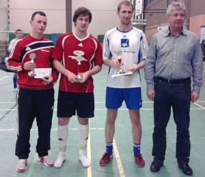 Rang 3 ging nach Neunmeterschießen an Rot Weiß Wetzlar, Vierter wurde der TuS Bonbaden. Auf dem Foto links die Kapitäne der drei erstplatzierten Teams (v.l.) Marc Beissert (RW Wetzlar), Paul Bunkov (Eintracht Wz.) und Tobias Grothe (Werdorf) mit Turniersponsor Heinrich Krion.