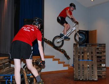 Nach einem Grußwort des 1. Vorsitzenden Dieter Schulz heizte der „Glee Club“ der Alexander-von-Humboldt-Schule Aßlar (Foto links) die Stimmung im Saal schon einmal ordentlich an. Es folgte ien sportliche Darbietung der Spitzenklasse: Lukas Welker und Sönke Südbrock vom Bike-Trial-Show Team zeigten den Zuschauern ihr großes Können auf Trial-Rädern und sprangen mühelos auf hohen Euro-Paletten hin und her (Foto unten).