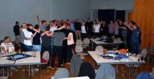 Nach einem gemeinsamen Abendessen hatten nicht nur die Fußballer beider Vereine, sondern auch die zahlreichen Besucher im vollbesetzten Saal der „Siedlerklause“ Gelegenheit, das Traditionsländerspiel Deutschland gegen England auf Großleinwand zu sehen. Dass dabei, unabhängig vom Ergebnis, eine großartige Stimmung herrschte und beide Lager mit Gesängen beeindruckten, versteht sich von selbst. Am Ende hatten, wie im Berliner Olympiastadion, auch hier die Engländer knapp die Nase vorn. Den würdigen Abschluss bildete das unvermeidliche „You’ll never walk alone“, das seit 40 Jahren immer gemeinsam intoniert wird (Foto unten).