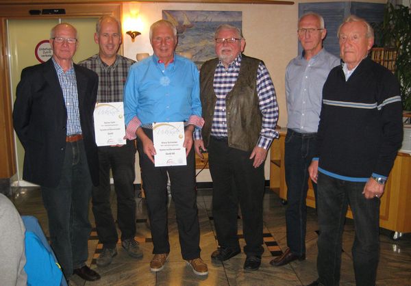 Auf dem Foto die Geehrten (von links): Jochen Simon, Reiner Gath, Klaus Schneider, Fritz Lenz, Erster Vorsitzender Dieter Schulz und Ehrenausschuss-Vorsitzender Jürgen Benner. Es fehlt Frank Dubiys.