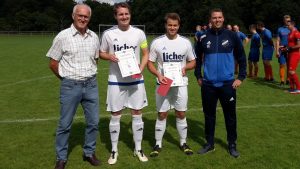 Andy Potapov, Kapitän Patrick Meisterjahn in seinem 250. Spiel für den RSV sowie Flo Bunde schossen bereits zur Halbzeit eine deutliche Führung heraus, ehe die in Durchgang 2 couragierter auftretenden Gäste zu spät zum Anschluss kamen. Leonel Nelson Nana Yomba machte mit seinem Premierentor im Dress der ersten Mannschaft zum 4:1 schließlich den Deckel drauf. Weiterhin erwähnenswert ist noch die Tatsache, dass vor dem Spiel neben Meisterjahn auch „Urgestein“ David Kierok für seinen 400. Einsatz im blau-weißen Trikot geehrt wurde (Foto). Wir bedanken uns bei beiden für die langjährige Vereinstreue!