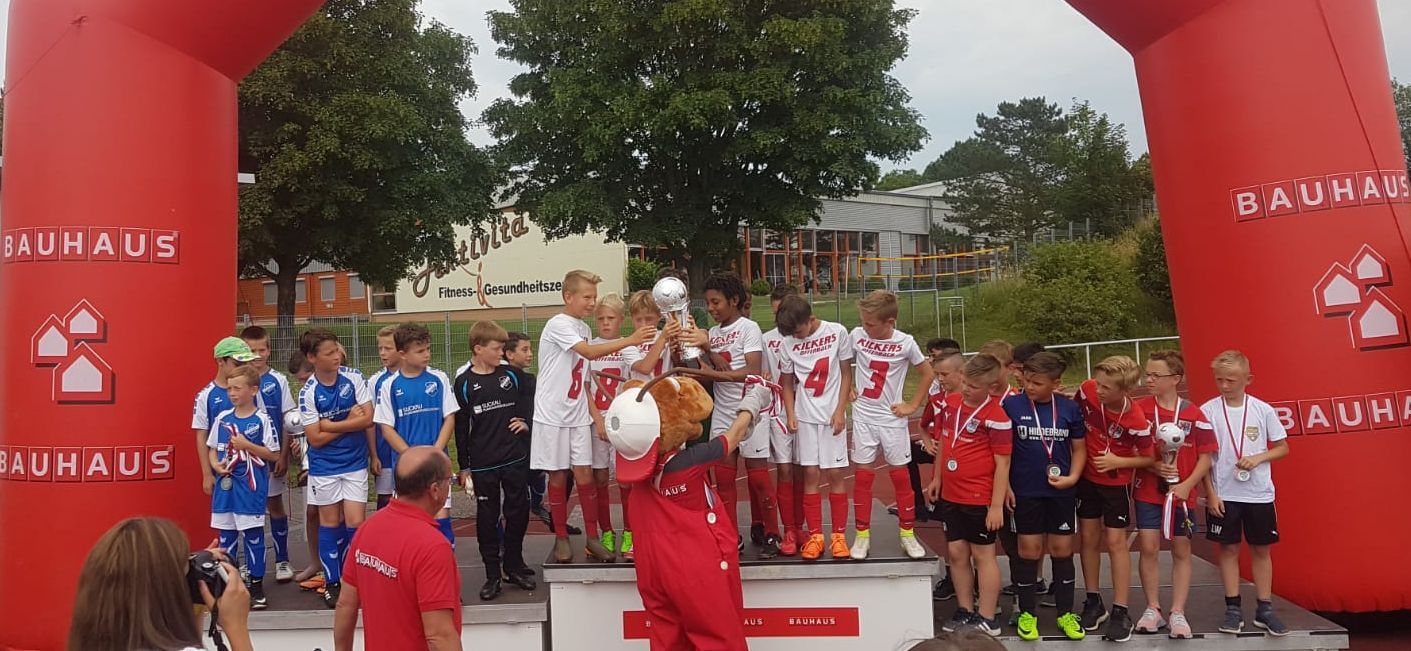 Dickes Ding: Beim Bauhaus-Masters-Finale in Heuchelheim war für die E-Jugend des RSV erst im Finale Endstation. In die Gruppenspiele startete man zwar etwas holprig mit einem 2:2 gegen Wetzbachtal, im Anschluss aber kam der RSV-Nachwuchs auf Touren und fegte die namhafte Konkurrenz vom Heuchelheimer Sportplatz. Zunächst gab man dem SV Wehen Wiesbaden mit 2:0 das Nachsehen, spielte dann 1:1 gegen den VfB 1900 Gießen – Nachwuchsförderzentrum und Seniorenfußball, schlug den Drittliga-Nachwuchs von FC Rot-Weiß Erfurt – Junioren mit 3:0 und besiegte dann auch noch die JSG Lollar/Staufenberg mit 2:0. Im Halbfinale gewann die von Vito Lafata betreute Truppe mit 1:0 gegen Daaden und so wartete im Endspiel der Nachwuchs von Kickers Offenbach.