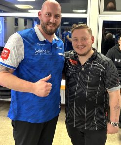 Unser Kapitän Kevin Misgaiski (Foto) zog das große Los, durfte sich mit Schindler messen und blieb erwartungsgemäß chancenlos. Immerhin: einen Checkdart auf die Doppel 20 erspielte sich „The Humble“ gegen „The Wall“, der aber vergeben wurde. Schindler spielte weitestgehend unspektakulär – trotzdem stand am Ende ein Average von 92 Punkten auf der Anzeigetafel und damit der höchste Average, der im Juppy Pally je gespielt wurde. Beeindruckend! Am Ende siegten die Aarows mit 8:4, was letztlich dann aber irgendwie doch nur Nebensache war.