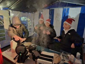 Bereits um 15 Uhr füllte sich der liebevoll gestaltete Platz mit Groß und Klein, die gerne vom reichhaltigen Angebot an Essen und Trinken Gebrauch machten. So boten die Jugendfußballer Waffeln an, „Küchenmeister“ Roland Rink samt Eisstock-Team hatte wieder sein legendäres Kesselgulasch und eine Kürbissuppe gezaubert und die Besucher wurden mit selbstgemachten Crêpes verwöhnt.